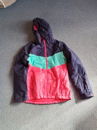 Chaqueta de esquí para niña con diseño tricolor. - Mangas y parte superior azul marino. - Banda central en color verde menta. - Parte inferior en color rosa fucsia. - Capucha integrada.