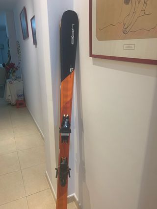 Conjunto de esquís Elan Team con fijaciones. - Diseño en azul y amarillo. - Marca: Elan - Modelo: Team - Talla de bota: 38