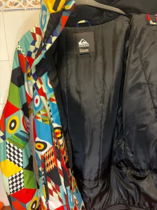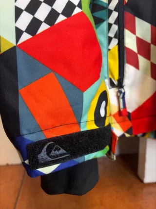 Chaqueta técnica Quiksilver con un diseño geométrico multicolor. - Cierre de cremallera. - Cierre de velcro en puños. - Logo de Quiksilver visible. En muy buen estado,un solo uso Talla S de hombre,es unisex válida para una M de mujer.