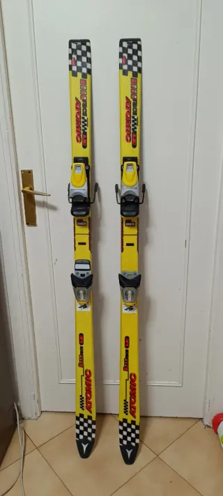 Par de esquís Atomic Race Carv de 150cm. - Color amarillo vibrante con detalles en negro y rojo. - Diseño con patrón de tablero de ajedrez en la espátula y la cola. - Fijaciones Atomic incluidas.