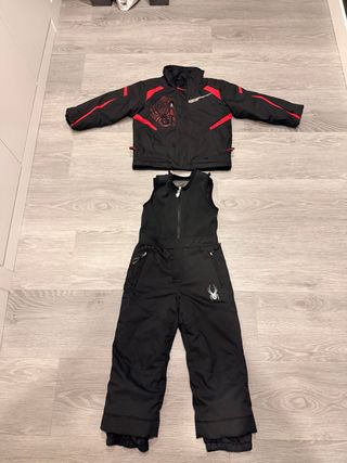 Conjunto de esquí infantil de dos piezas, marca Spyder. Incluye chaqueta y pantalón. - Chaqueta negra con detalles rojos y diseño gráfico. - Pantalón negro con logo de Spyder. Para 6,7 años