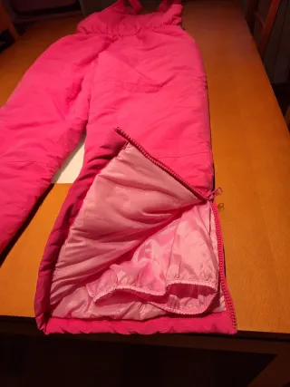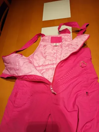 Peto de esquí de color rosa fluorescente para niña. Se ha usado una sola vez. Ideal para la nieve y actividades al aire libre. - Tirantes ajustables con hebillas. - Cintura con trabillas para cinturón. - Cierre frontal.