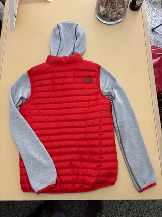 Chaqueta híbrida de The North Face con cuerpo de plumas y mangas de algodón. Reversible 2 colores. Bolsillos ambos lados - Cuerpo principal acolchado en color rojo. - Mangas y capucha en tejido de sudadera gris jaspeado. - Logo de The North Face visible en el pecho.