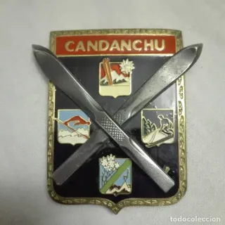 Placa conmemorativa de Candanchú, con un diseño inspirado en el esquí y la montaña. - Escudo con borde dorado. - Inscripción CANDANCHU en rojo. - Motivos de esquí y paisajes de montaña.