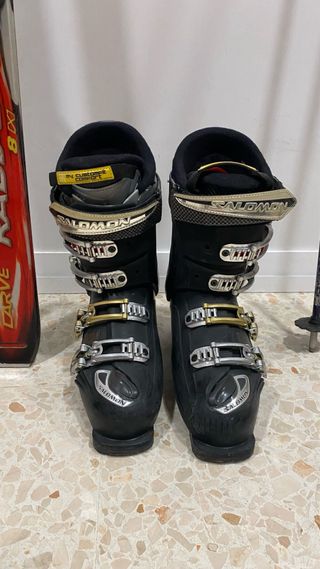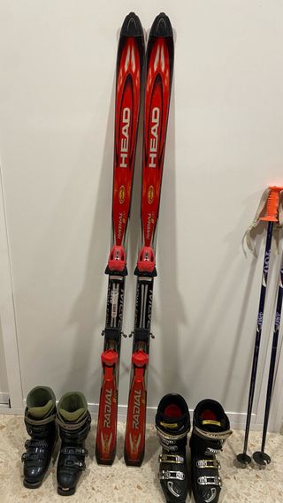 Completo conjunto de esquí para disfrutar de la nieve. - Esquís Head Radial 80. - Botas de esquí Salomon negras y verdes. Talla 24 (38-39). - Botas de esquí Salomon negras y amarillas. Talla 26 (40-41). - Bastones de esquí con empuñadura naranja. Precio negociable.
