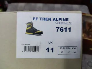 Botas de montaña FF Trek Alpine en color negro y amarillo. Perfectas para senderismo, actividades al aire libre y alta montaña - Talla UK 11 / EUR 46 / USA 12 / CM 30. - Modelo: 7611. - Código de barras: 8 431401 169973.