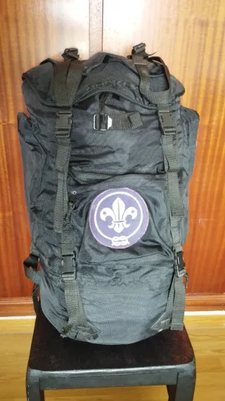 Mochila Bosker de color negro, con parches cosidos de Scouts. Muy comoda, con muchos bolsillos, cierres rapidos, herraje de aluminio por el interior... Tiene mucho tiempo pero se hay usado muy poco. Es una buena mochila comprada en una tienda de cosas militares. Solo tiene el impermeable un poco gastado. No se de cuantos litros es, pero mide algo más de 60 centímetros de alto.