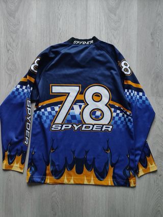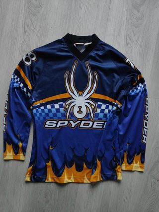 Camiseta de manga larga con diseño llamativo de Spyder. - Color azul principal con detalles naranjas y blancos. - Estampado de araña grande en el pecho. - Diseño de llamas en la parte inferior. - Número 8 en la manga izquierda. - Logo SPYDER en el pecho.