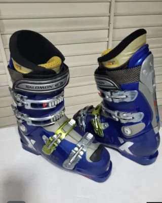 Botas de esquí de la marca Salomon en color azul y gris. Cuentan con un diseño moderno y cierres ajustables. Signos de desgaste por uso en zonas empeine se aprecia falta goma Ganchos y cierre perfecto Con dos alquileres quedan amortizadas - Marca: Salomon - Color: Azul y gris - Cierres de hebilla