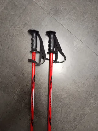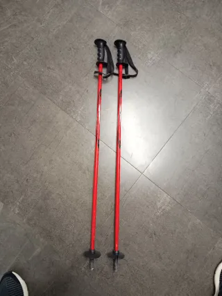 Par de bastones de esquí de color rojo, diseñados para niños. Cuentan con empuñaduras negras y correas para mayor comodidad. - Color: Rojo - Empuñaduras: Negras - Correas incluidas
