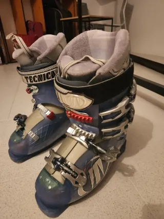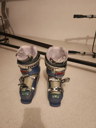 Botas de esquí de la marca Tecnica, diseñadas para ofrecer rendimiento y comodidad en la montaña. - Cierre con hebillas metálicas. - Interior forrado para mayor calidez. - Diseño deportivo en azul y gris. - Talla 38, muy cómodas - Tener en cuenta que una de ellas está rota en la parte de empeine/dedos