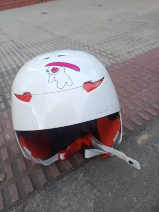 Casco de esquí blanco con un divertido diseño. - Color blanco brillante. - Adhesivo de personaje en la parte frontal. - Detalles en color rojo. - Correa de sujeción ajustable.