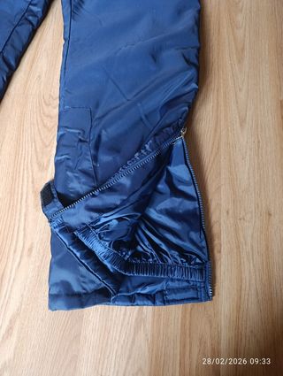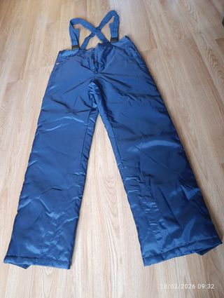 Pantalón de esquí de color azul, ideal para la montaña. Cuenta con tirantes ajustables para mayor comodidad. - Tirantes cruzados en la espalda. - Cierre de cremallera y botones. - Tejido resistente al agua y al viento. - Talla 48,aunque es más una 46.