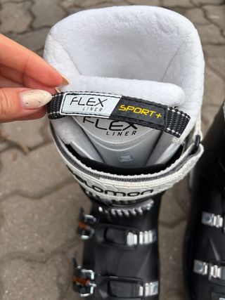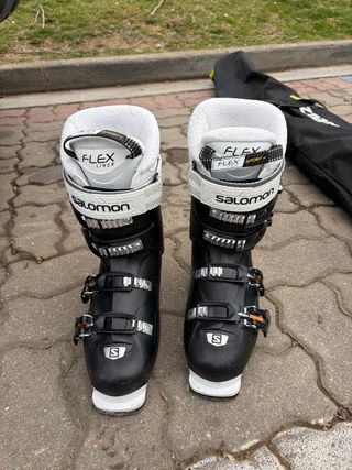 Botas de esquí Salomon con forro interior Flex Liner. PRECIO NEGOCIABLE - Color negro y blanco. - Cierre con hebillas en cobre y plata - Logo de Salomon en la caña. - Detalle Flex Sport+ en la parte superior. - 70 wide - Calf adjuster - Oversized pivot para mas holgura y comodidad Buen estado, con uso medio pero muy buen cuidado (se aprecia en la suela) PRECIO NEGOCIABLE