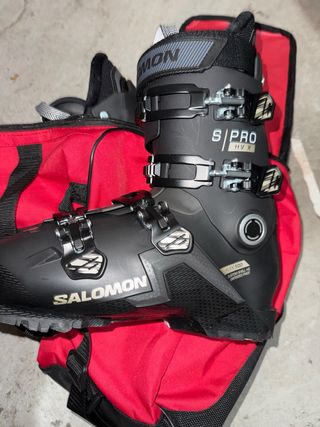 Botas de esquí Salomon S/Pro HV X en color negro. Diseñadas para un ajuste cómodo y de alto rendimiento. Usadas dis veces contadas - Marca: Salomon - Modelo: S/Pro HV X - Color: Negro - Cierres: Hebillas ajustables - Flex: 100