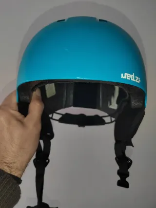 Casco de esquí de color azul, marca Wedze. Diseñado para proteger durante la práctica de deportes de invierno. - Color azul brillante. - Marca Wedze visible. - Cintas de ajuste negras.