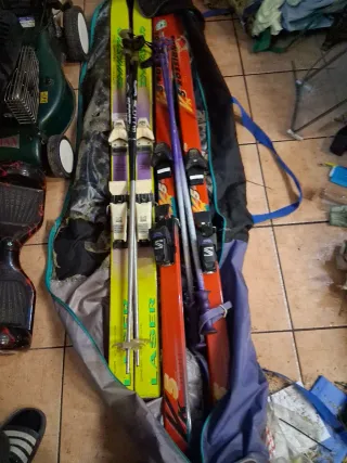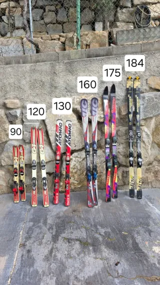 Conjunto de esquís y bastones de diferentes medidas. Esquís: Rossignol 184 cm: 90€ Blizzard 175 cm: 80€ Atomic 160: 80€ Atomic Race 130 cm: 70€ Dynastar Star 120 cm: 60€ Dynamic Star (pequeños) 90 cm: 50€ Palos (todos los palos 10€) 85 cm 95 cm 120 cm 120 cm 127 cm
