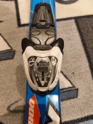 Conjunto de esquís Nordica para niños, listos para la nieve. - Esquís de 120 cm. - Fijaciones Nordica. - Diseño en azul y naranja.
