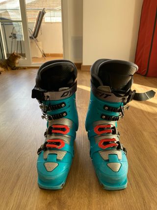 Botas de esquí de travesía Dynafit Radical en color turquesa. Diseñadas para un buen rendimiento en montaña. - Talla 38,5 - Usadas durante 4 temporadas, tienen signos de desgaste como se muestra en las fotos pero aun se pueden seguir usando. - Me las vendo ya que he cambiado a unas mas ligeras y técnicas. - Modelo Dynafit Radical.
