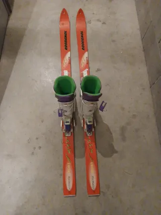 Conjunto de esquí Rossignol para jóvenes esquiadores. - Esquís Rossignol de color rojo con detalles en verde y amarillo. - Fijaciones de esquí. - Botas de esquí de color blanco con interior verde y detalles morados.