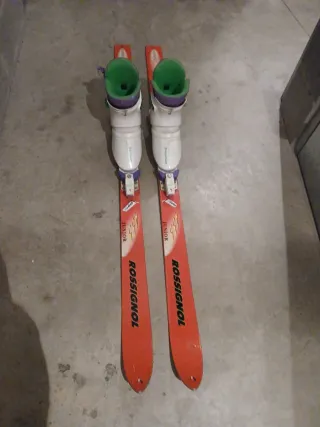 Conjunto de esquís de la marca Rossignol, listos para la nieve. - Esquís con fijaciones. - Bastones de esquí incluidos.