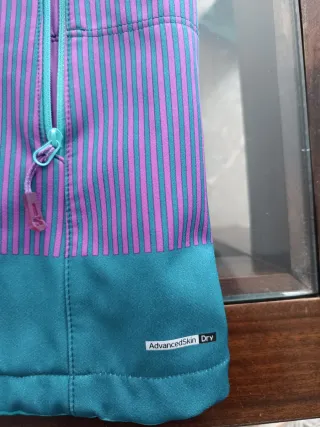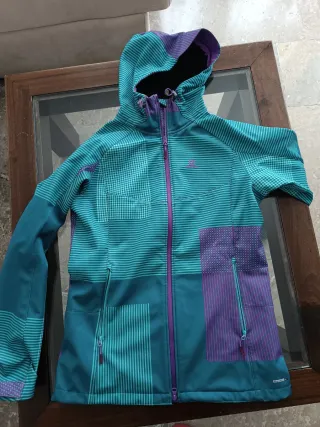 Chaqueta técnica Salomon, ideal para esquí o snowboard. Diseño moderno y funcional. - Color principal turquesa con detalles en morado. - Patrón a rayas y cuadros. - Capucha integrada. - Cremallera frontal. - Bolsillos con cremallera.