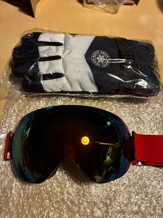 Conjunto de gafas de esquí con lente espejada y guantes negros. - Gafas con correa ajustable - Guantes negros con detalles rojos y l