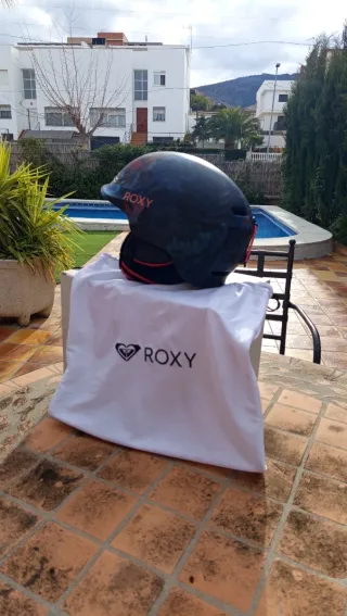 Casco de snowboard de la marca Roxy. Incluye funda protectora. - talla 56. - Diseño estampado rosa y azul. - Cierre ajustable. - Incluye funda de tela con logo Roxy.