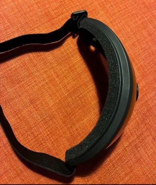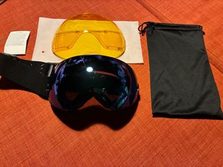 Set de gafas de esquí con lente adicional y funda protectora. - Lente principal con acabado espejado. - Lente secundaria de color amarillo. - Correa ajustable. - Incluye funda de tela negra.