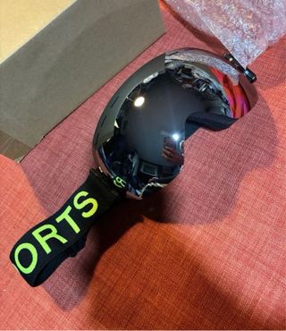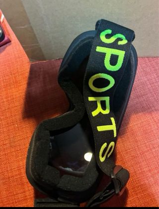 Gafas de esquí con lente espejada y correa. - Lente espejada. - Correa negra con letras SPORTS en verde neón.