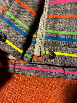 Chaqueta de esquí con un diseño vibrante y llamativo. Perfecta para mantenerte abrigado y con estilo en la montaña. - Diseño de rayas multicolores sobre fondo gris. - Capucha integrada. - Cremalleras en los bolsillos laterales. - Puños ajustables con cremallera.
