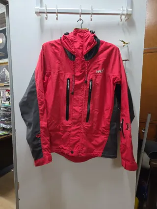 Chaqueta ESQUI O SNOW técnica Halti. Talla 48, M. Con un diseño bicolor en rojo y gris Cremalleras termoselladas. Cremalleras frontales y en bolsillos. Capucha ajustable. Puños con velcro. Marca de gama alta en calidad de ropa para nieve.