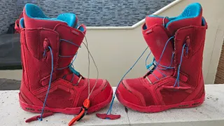 Botas de snowboard Burton Ambush en color rojo y azul. - Talla 44. - Sistema de lazada rápida. - Suela con buen agarre. Con marcas de uso pero nada roto. Perfectamente impermeables.