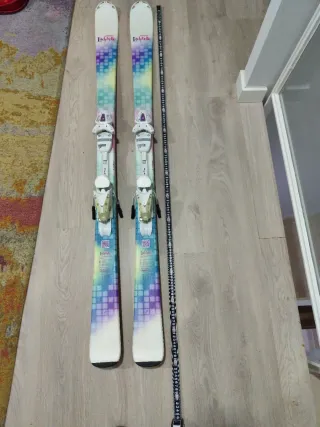 Esquís marca K2 para niña con un diseño divertido y colorido. En perfecto estado, todos los cantos están sin desperfectos y nunca han sido reparados. Se venden porque se le han quedado pequeños a mi hija. - Base con estampado floral y de montañas. - Fijaciones incluidas.