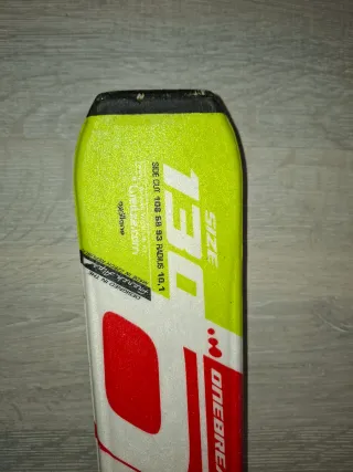 Esquís Wedze de 130cm con fijaciones. - Diseño deportivo en rojo, blanco y verde lima.