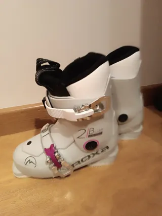 Botas de primera mano, compradas nuevas hace 2 años. Talla 195-205 correpondiente a número 28-31 de calzado de calle. - Cierre con hebillas. - Diseño en color blanco con detalles en morado. - Interior forrado en negro. Estan impecables