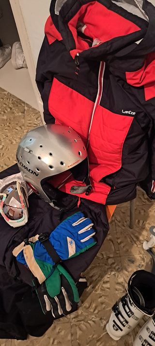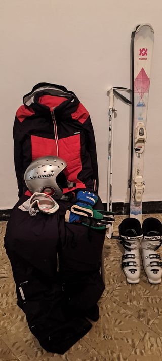 Conjunto completo de esquí para disfrutar de la montaña. - Chaqueta de esquí negra y roja. Talla 14 - Pantalones de esquí negros, pull and feet. Talla S-M - Casco de esquí plateado marca Salomon.55-58 cm - Gafas de esquí. - Guantes de esquí. S - Botas de esquí blancas marca Salomon. 23.5 - Esquís blancos con fijaciones. 130 cm - Bastones de esquí.