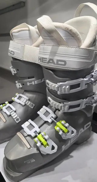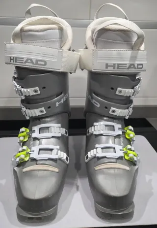 Bota seminueva de esquí HEAD Raptor 115 para mujer, talla 24.5 (EU 38/39). Diseñada para un rendimiento óptimo en la pista. - Color gris plateado. - Cierre con múltiples hebillas. - Marca HEAD visible en la correa superior.