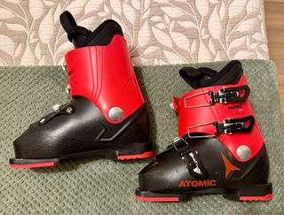 Botas de esquí Atomic HAWX para niños, con un diseño llamativo en negro y rojo. - Cierre con hebillas. - Marca: Atomic. - Modelo: HAWX KIDS 3 Talla 21,0-21,5