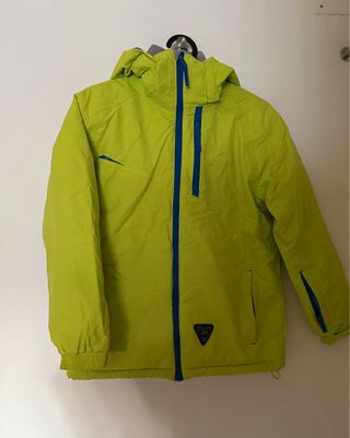 Chaqueta de esquí de color verde brillante con detalles en azul. - Cremallera frontal azul. - Bolsillo con cremallera en el pecho. - Bolsillo lateral con cremallera. - Capucha integrada. - Puños ajustables. Talla 9/10 (134 a 140 cm) Regalo guantes