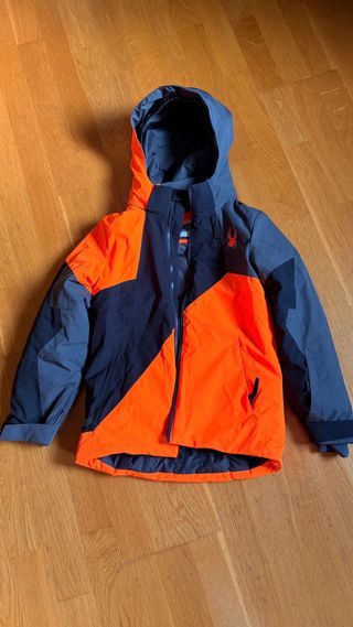 Chaqueta de esquí con un diseño moderno y llamativo, Talla 10, puesta una sola vez. - Combinación de colores naranja, negro y gris. - Logo de Spyder en el pecho.