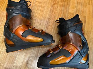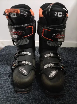 Botas de esquí Salomon con sistema SCS. - Cierre con hebillas. - Diseño en color negro y naranja. - Marca Salomon.