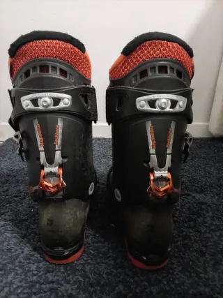 Botas NORDICA Fire Arrow de tamaño Mondopoint 275mm, equivalente a un 42,5 EU = 8,5 UK = 9,5 US. El exterior para la fijación es 315mm. Regalo Bolsa para fácil transporte de las botas. Botas de gama alta. Destacan por su comodidad. Mejor probarlas. Se corresponde con un pie número 42,5-43. - Diseño en color rojo y negro. - Cierre micrométrico (que se regula la dureza de cada gancho) de hebilla metálica.