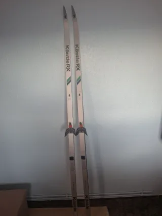 Esquís de la marca Kästle, modelo RX. Diseñados para ofrecer un buen rendimiento. - Esquís de color blanco con detalles en verde y azul. - Fijaciones negras y rojas incluidas.