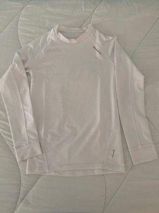 Camiseta térmica de manga larga de la marca Quechua. - Color blanco. - Cuello redondo. - Logo de la marca en el pecho y en la parte inferior. -talla 8/10