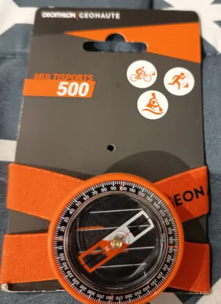 Brújula Geonaute modelo 500, diseñada para multideportes. Incluye una goma adaptable para su sujeción. - Diseño en color naranja y negro. - Escala de grados en el bisel giratorio. - Nueva a estrenar.