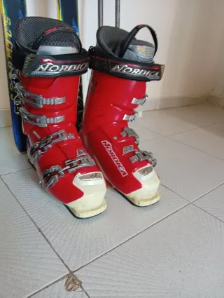 Se vende conjunto de botas de esquí y esquís para montaña. Ideal para disfrutar de la nieve. - Botas de esquí negras con detalles en rojo y plateado. - Esquís de montaña con diseño en rojo y azul. Botas black nordica37 Botas red nórdica 41 Como nuevos usados una vez.