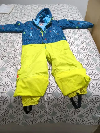 Mono de nieve de la marca Decathlon, talla 5. Ideal para actividades en la nieve. - Diseño con capucha. - Parte superior azul con estampado. - Pantalón de color amarillo neón.