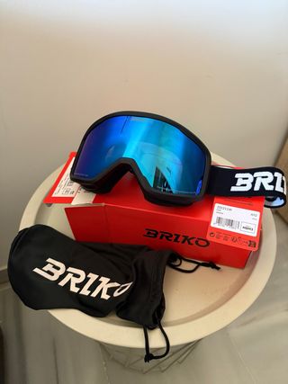 Gafas de esquí o snowboard de la marca BRIKO. Incluyen funda protectora. - Lente con acabado espejo azul. - Correa ajustable con logo. - Montura negra.