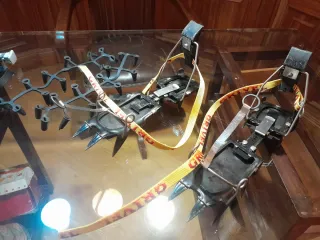 Crampones Grivel G12 con correas amarillas. - Diseño robusto. - Correas de sujeción. - Puntas metálicas. Se trata de un modelo clásico de 12 puntas para montañismo y alpinismo. Diseñado para caminatas por glaciares, montañismo clásico y técnico, y rutas mixtas de hielo y roca. Fabricado en acero cromoly mayor resistencia y durabilidad, con 8 puntas delanteras y 4 traseras. Cuenta con el sistema antibott de Grivel, que ayuda a evitar la acumulación de nieve debajo del crampón. Talla ajustable. Se vende además, conjuntamente o por separado, Piolets de alpinismo/ escalada en hielo 70 euros cada uno.